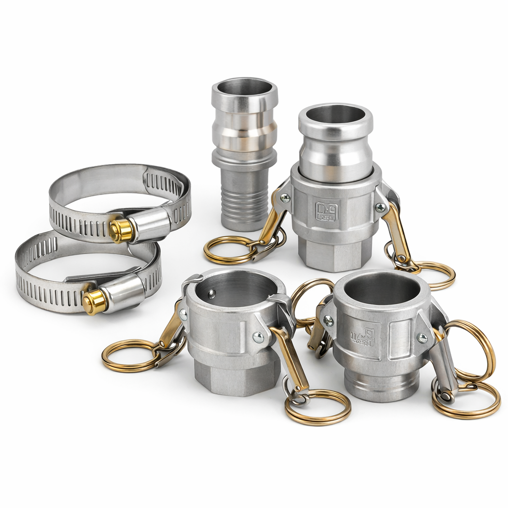 Хомуты Используются для надежной фиксации шлангов и рукавов на штуцерах, трубах и соединениях. Обеспечивают герметичность и предотвращают утечки. Камлоки (camlock соединения) Предназначены для быстрого соединения и разъединения рукавов и трубопроводов без использования инструмента. Обеспечивают герметичное и удобное подключение в системах перекачки жидкостей и сыпучих материалов.